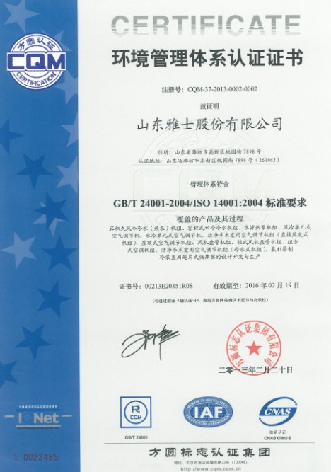 環(huán)境管理體系認(rèn)證證書(山東)