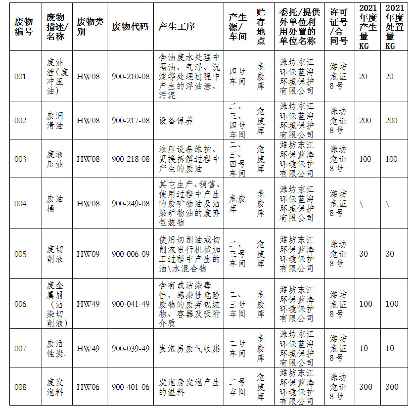 2021年危險(xiǎn)廢物產(chǎn)生量為760kg,貯存760kg,處理危險(xiǎn)廢物760kg,年底庫(kù)存量0kg。其中廢油渣(廢沖壓油)(HW08)20噸、廢潤(rùn)滑油(HW08)200kg、廢液壓油(HW08)100kg、廢切削液(HW09)30kg、廢金屬屑(沾染切削液)(HW49)100kg、廢活性炭(HW49)10kg、廢發(fā)泡料(HW06)300kg。